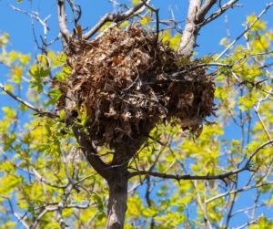 Squirrels typically have two different kinds of nests, a drey nest and a cavity nest, also known as a den. Dreys are squirrel nests built out of leaves, twigs, insulation, moss, paper, or whatever else they can find. Squirrels will build dreys high up in the forks of trees, where branches cross or in other nooks and crannies. Cavity nests are built inside the cavity of a tree, and these nests consist of the same material that makes up a drey, but with the added shelter of the tree. Squirrels will also build “vacation homes” which are secondary nests they use during the day to store extra food or hide from predators.